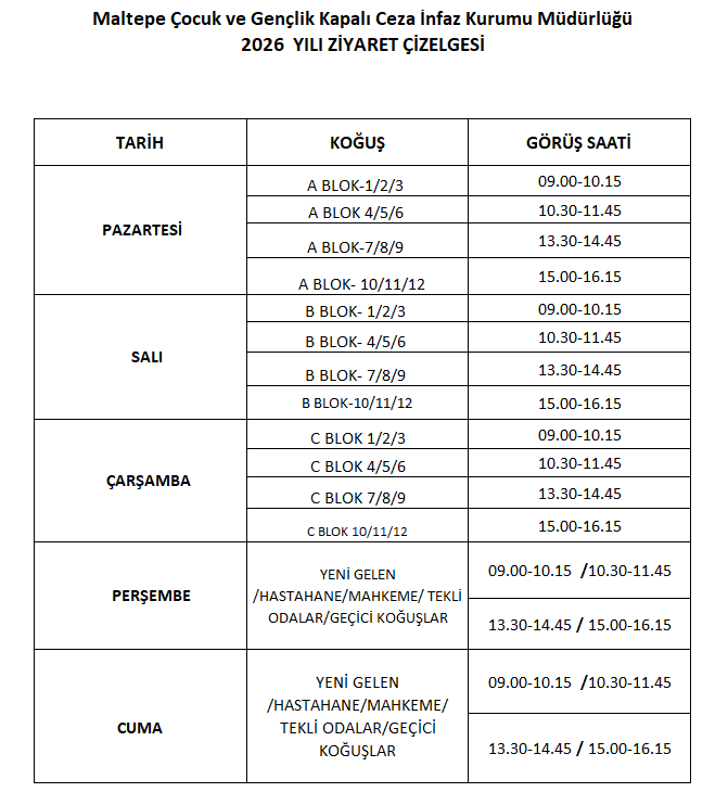 Maltepe Çocuk ve Gençlik Kapalı Ceza İnfaz Kurumu 2026 Yılı Görüş Çizelgesi